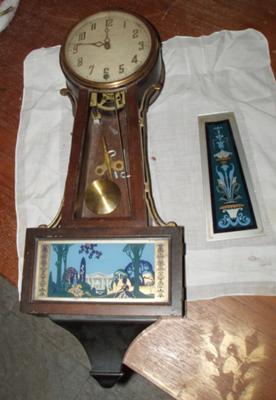 It is a New Haven Banjo clock from what I have discovered. It seems to have all the pieces except for a missing Eagle or other top ornament. The cabinet glass needs reassembling and it needs a good clean and refurbish.
